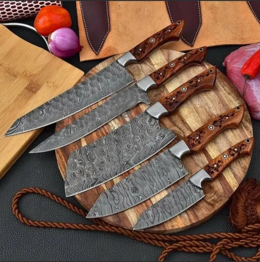 Custom handmade Damascus steel kitchen chef set with leather roll 06 pcs